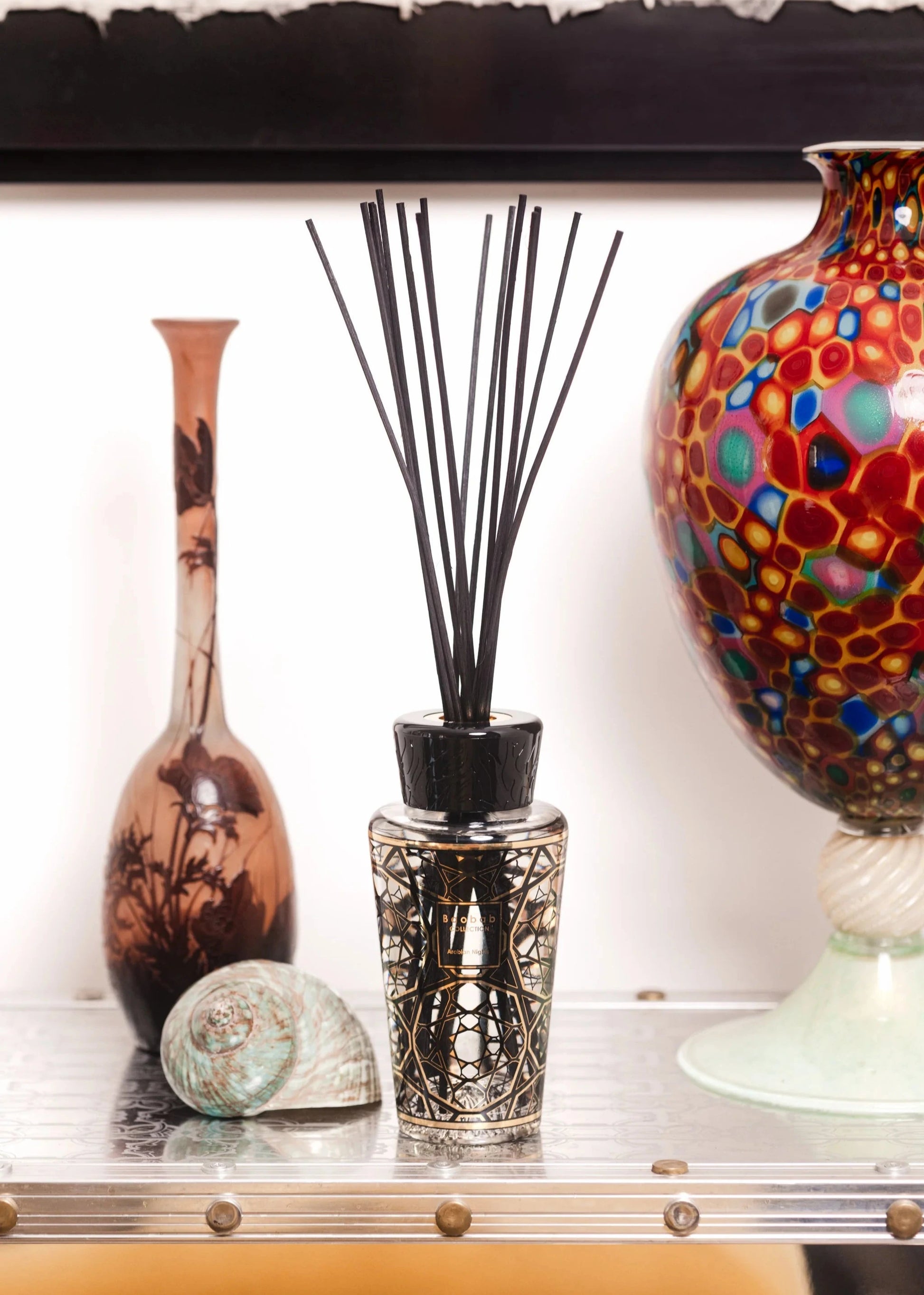 Le diffuseur de parfum d'intérieur Arabian Nights répandra un parfum boisé dans votre intérieur. Le verre décoré d’une sérigraphie noir et or est d’un raffinement extrême rappelant celui des palais du Moyen Orient. Le précieux motif, inspiré par les célèbres moucharabieh, donne au flacon une identité décorative se rapprochant d’un objet de collection.