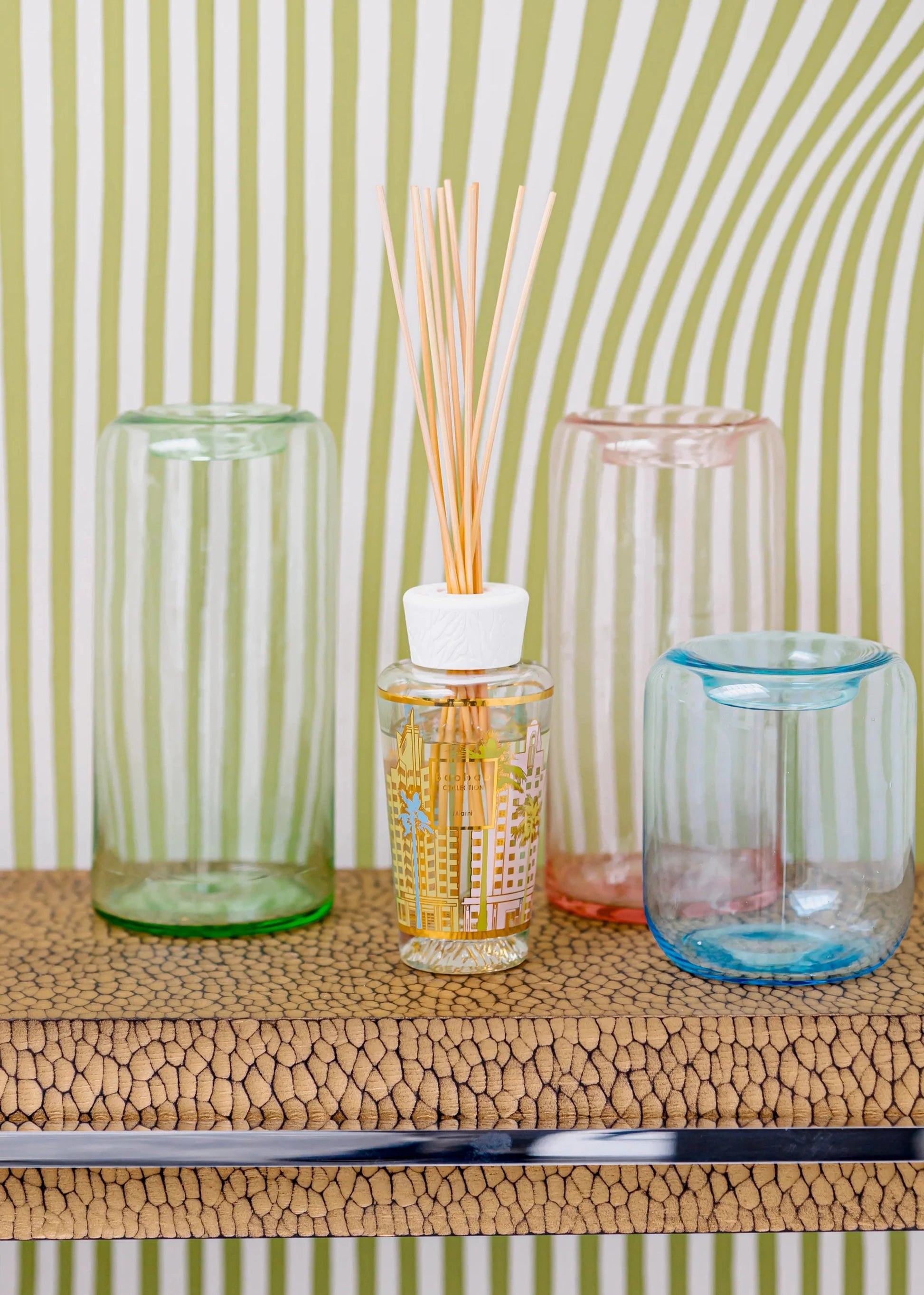 Le diffuseur de parfum d'intérieur Miami est décoré d'une sérigraphie aux tons pastels et or inspirée de l'architecture des bâtiments Art Déco à South Beach.16 cm | 250 ml