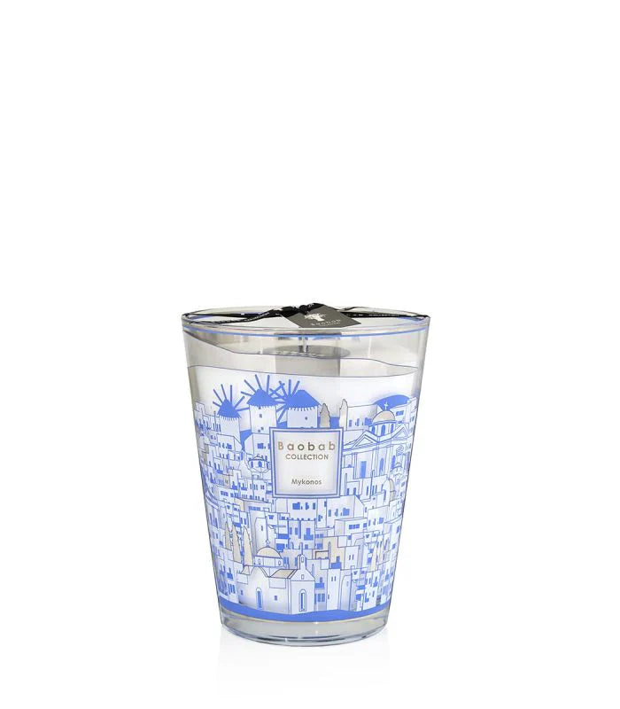 La bougie parfumée Mykonos est réalisée dans un verre recouvert d’une sérigraphie représentant le merveilleux village dont elle porte le nom. Le dessin stylisé a été posé à la main par nos artisans et recouvre la bougie d’un jeu de transparence mettant en valeur l’architecture du lieu. Son parfum de basilic, de jasmin et de patchouli vous emporte dans les effluves d’un été gorgé de soleil.