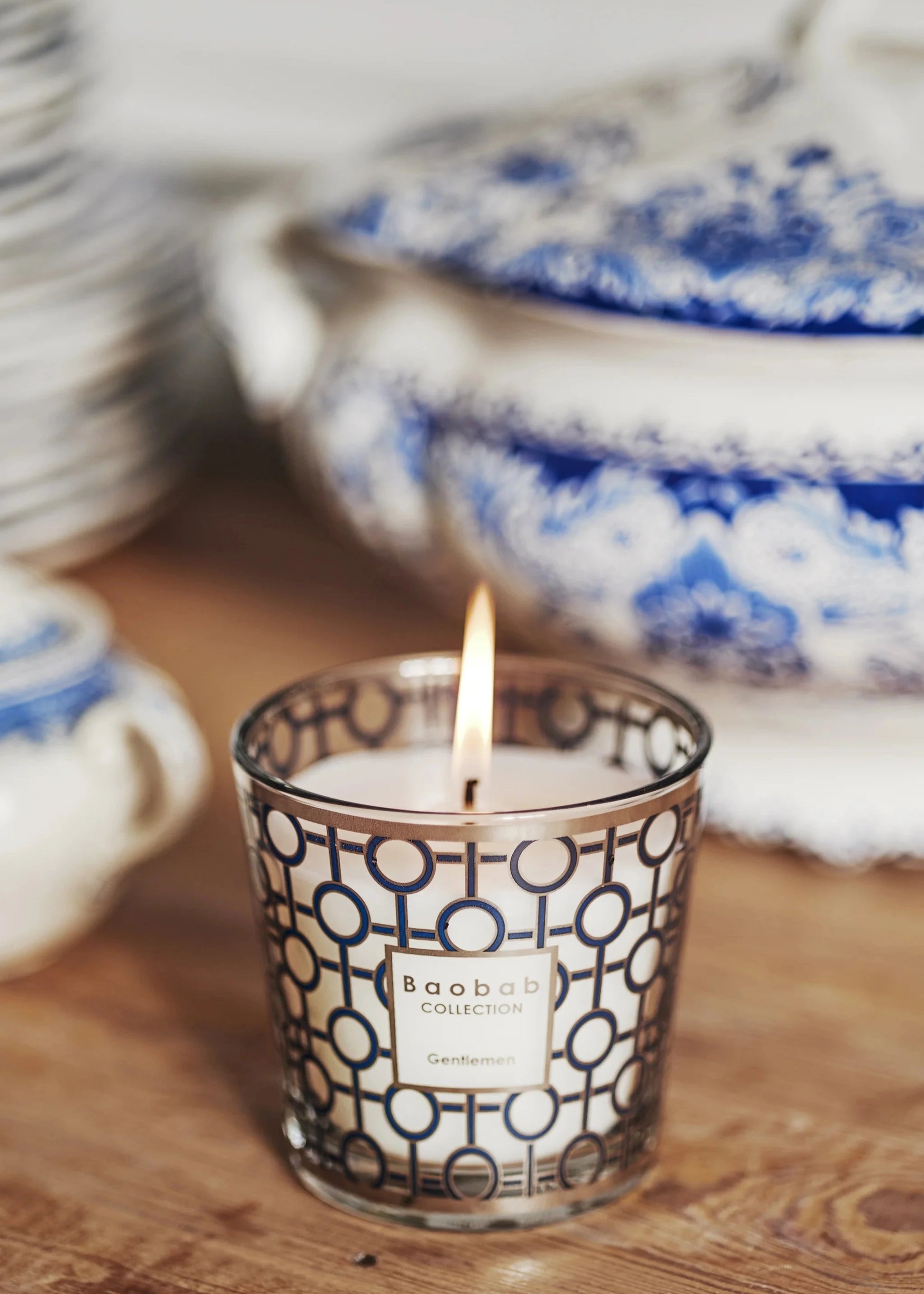 La bougie parfumée Gentlemen est réalisée dans un verre recouvert d’une sérigraphie platine et ultramarine et dégage des notes masculines. La bougie parfumée au rhum diffuse un parfum irrésistible, masculin avec une touche de safran. Les bougies comme celles-ci trouveront leur place dans n'importe quel maison d'homme.