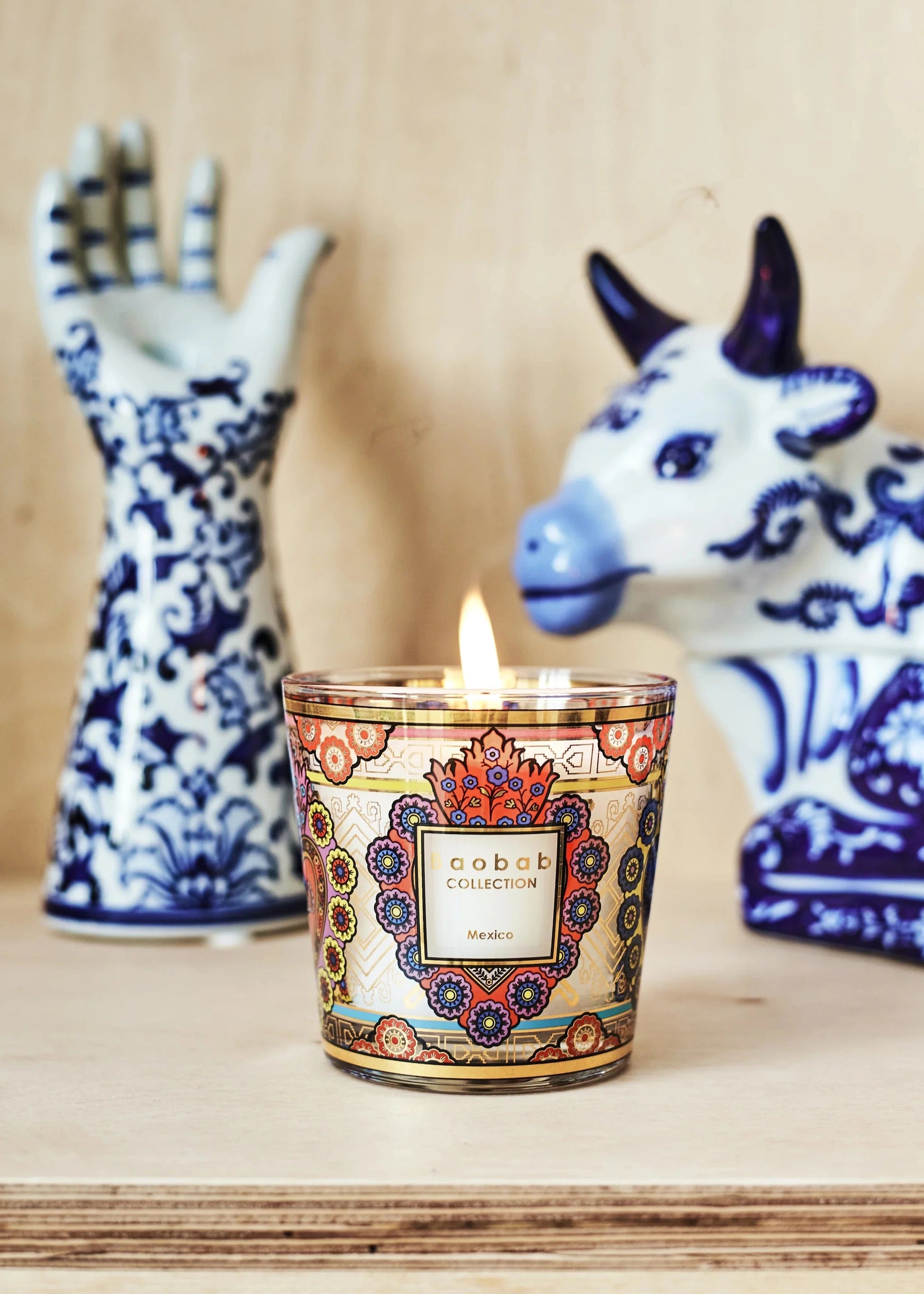Le verre de la bougie parfumée Mexico est recouvert d’une sérigraphie de couleurs et d’or représentant un ex-voto cœur, petit objet qui servait spirituellement à adresser un vœu ou remercier de la grâce qu’on nous accorde. Ces motifs de cœur se placent tout autour du verre et au fond on peut subtilement remarquer un motif de broderie que l’on retrouve dans l’artisanat mexicain et sur les corsages de Frida Kahlo.