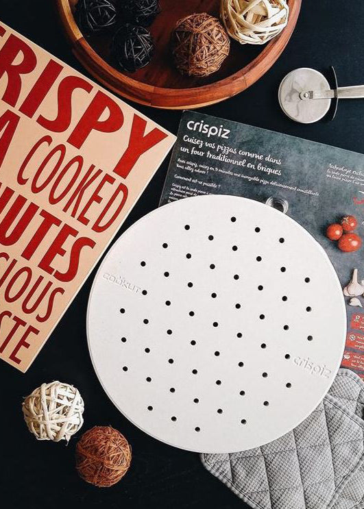 Crispiz est la seule pierre à pizza réalisée dans un matériau réfractaire percé de nombreux trous. La pierre réfractaire emmagasine la chaleur pour une cuisson similaire à celle d’un four traditionnel en briques. En complément, les trous permettent à l’air chaud de venir cuire directement la pâte sous la pizza et d’éliminer l’humidité : fini la sensation désagréable de « pâte humide pas assez cuite » au centre de la pizza !