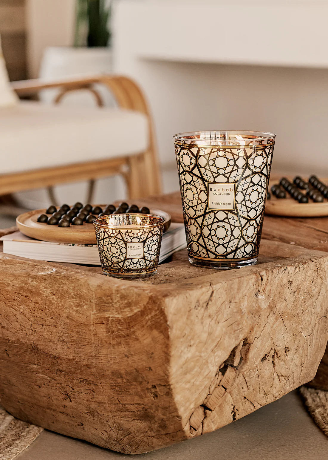 La bougie parfumée aux Nuits Arabian nous emmène dans le monde mystérieux du Moyen-Orient. Avec un écran en verre avec de l'or à 24 carats, il s'inspire du célèbre Moucharabieh, des motifs de travail ouverts trouvés dans l'architecture arabe. À travers le verre, la flamme apparaît comme elle crée une ombre enveloppante.